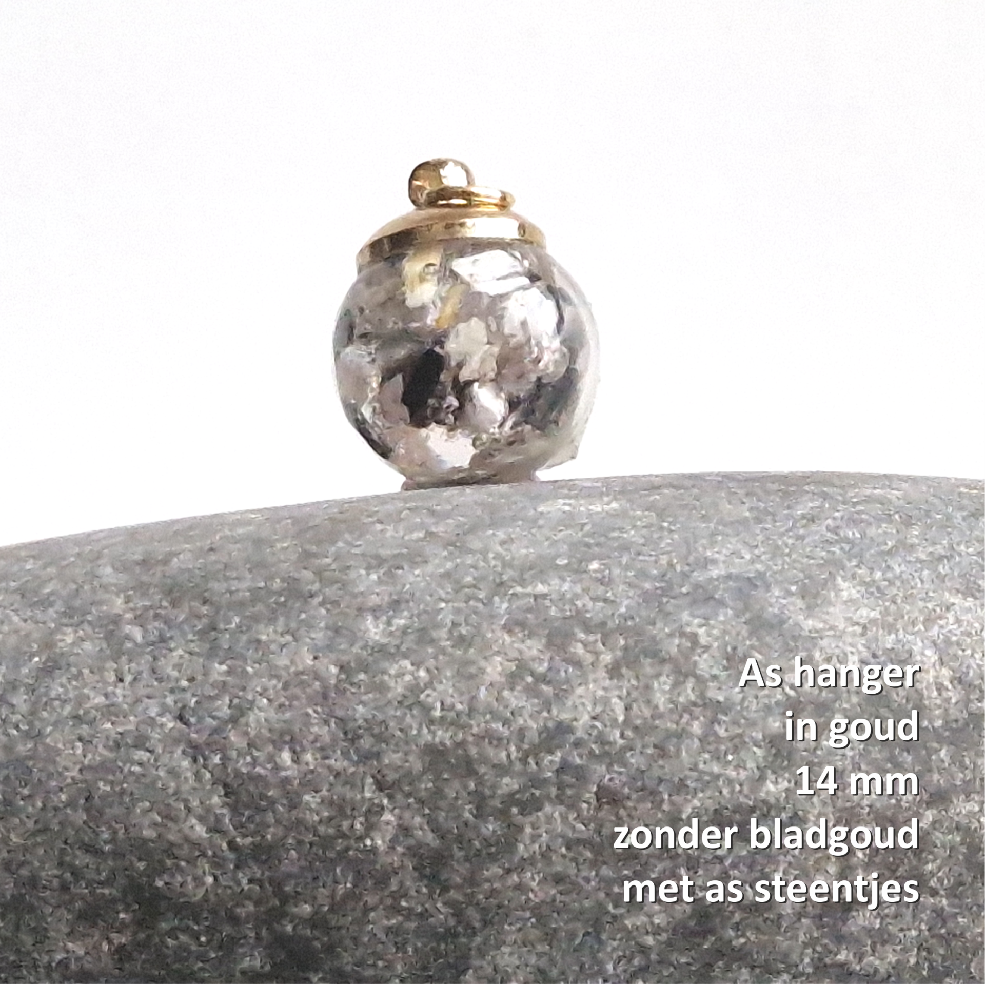 "Stel jouw unieke as-hanger helemaal zelf samen. Kies de kleur, zilver 925 of goldfilled 14K, met een ketting, keuze uit 3 soorten en 3 lengtes, of alleen de hanger. Maak het extra speciaal met bladgoud/-zilver en bepaal of je fijne as of as-steentjes wilt."