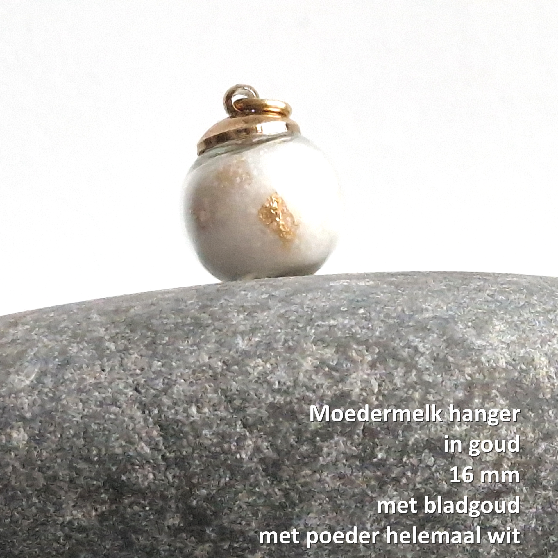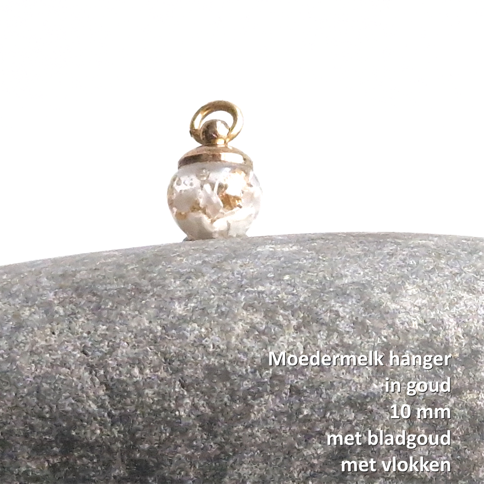 "Stel jouw unieke moedermelk hanger helemaal zelf samen. Kies de kleur, zilver 925 of goldfilled 14K. Maak het extra speciaal met bladgoud/-zilver, of kies voor zonder en bepaal of je een geheel witte bol wilt of met moedermelk vlokjes."